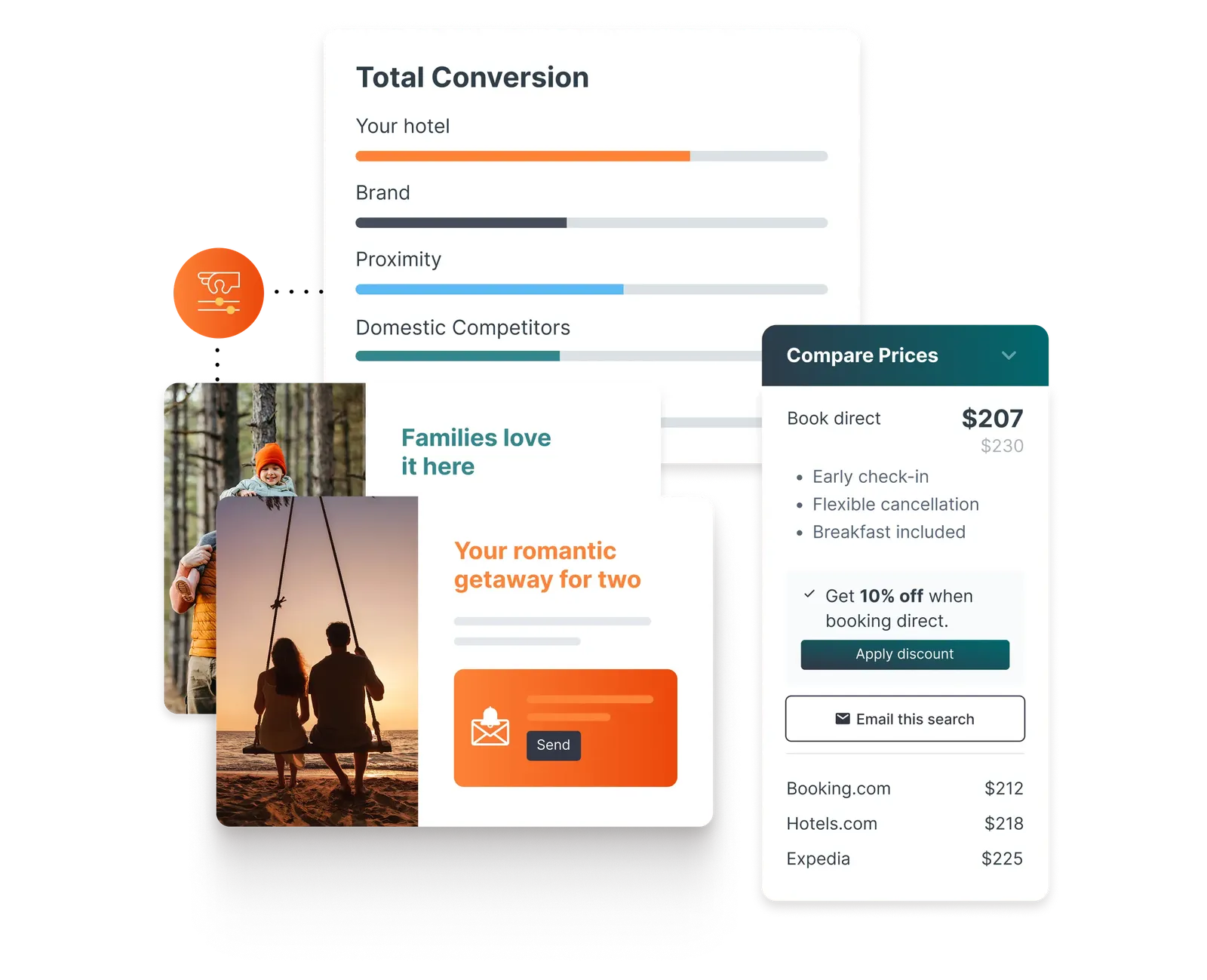 Different visitors need different experiences. Lighthouse Direct personalizes your website in real time based on signals like location, device, traffic source, stay dates and whether a guest is new or returning. By dynamically serving hyper-relevant content, Lighthouse Direct creates urgency, reduces bounce and guides more visitors to book direct. Guests can compare prices and read reviews without leaving your site—while you stay in control of rate parity.