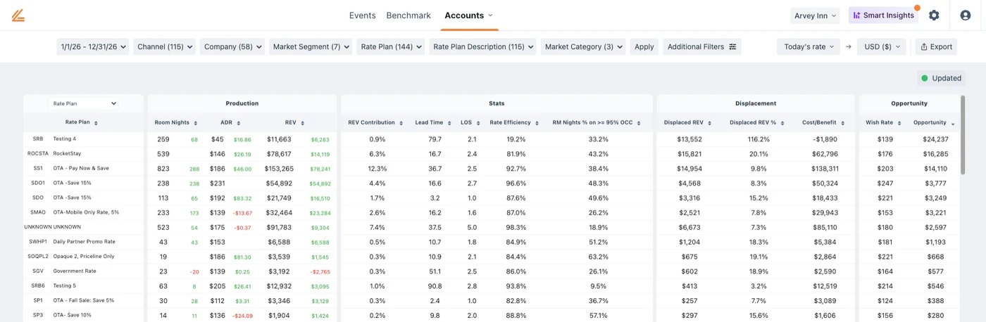 Or, even better, here’s what production looks like within Lighthouse Performance (notice that here we can see lots of other performance metrics like how often each rate or account stays on busy nights, and where rates should be re-aligned to)